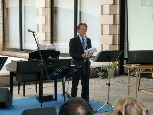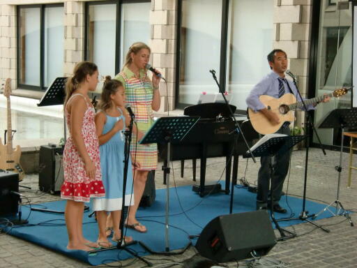 また、リスナーの集いが終了した後の16:30からは、淀橋教会前の野外会場で、尾崎先生のメッセージと道夫ファミリーによる 音楽演奏会『アカベ賛美の集い』が行われ、近隣の方々を集めて、歌と話の楽しい時間を過ごすことができました。