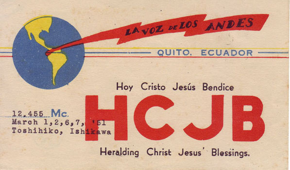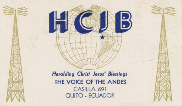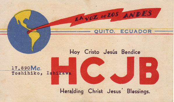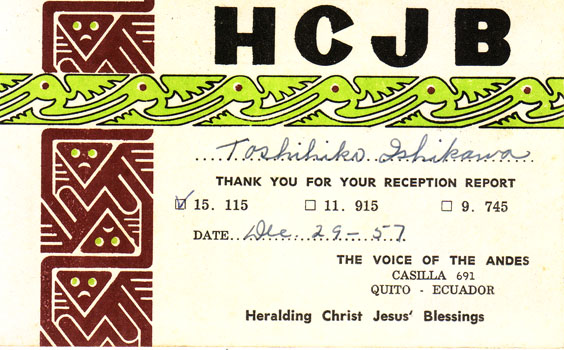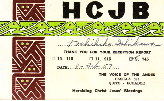 ![]() HCJBの送信所アンテナを表したベリカード (白石晋一さん提供) |